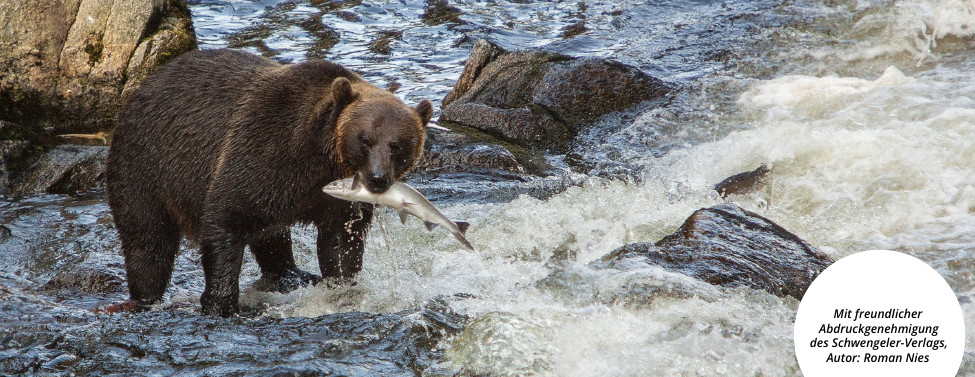 Lachse haben ein bewegtes Leben. In diesen Fischen steckt eine spannende Vita. Sie kommen in einem Fluss oder Bach Hunderte von Kilometern vom Meer entfernt auf die Welt. Sie wachsen heran und machen sich dann auf die lange Reise ans Meer. Im Meer angekommen, schwimmen sie zu ihrem neuen Lebensraum, der oft Tausende Kilometer von der Flussmündung entfernt liegt. Sie wachsen und gedeihen dann weiter einige Jahre, bis ihnen irgendetwas sagt, dass es Zeit wird, sich fortzupflanzen. Aber anstatt sich gleich vor Ort einen der zahlreichen Geschlechtspartner zu suchen, treten sie die lange Reise zurück an, um nach gefahrvollen Wochen genau an den Ort zu gelangen, wo ihr Leben begann – wenn sie nicht vorher gefressen worden sind. Am Ziel angekommen, pflanzen sie sich fort. Der Kreislauf ist geschlossen, das Tier stirbt bald danach. Das alles erscheint sehr rätselhaft. Warum tut sich ein Lachs das an? Die wenigsten erreichen das Ziel, weil die meisten auf der langen Reise auf der Strecke geblieben sind. Für viele Tierarten entlang der Reiseroute, dazu gehören Seeadler und vor allem Bären, stellen die wandernden Fische die Hauptnahrung dar, ohne die sie gar nicht überleben könnten. Die Seeflora und -fauna in Alaska braucht das grosse Lachssterben nach ihrer Fortpflanzung, denn ca. 80 Prozent ihrer Stickstoffversorgung geht darauf zurück!