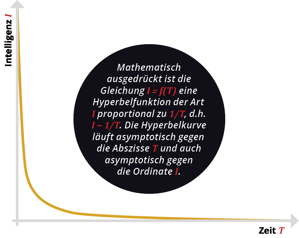 Die Zeitfrage können wir uns auch logisch erschließen: Stellen wir uns zwei Studenten vor, denen wir eine schwierige Aufgabe zur Lösung vorlegen. Der eine ist hochintelligent, der andere hat mit Müh und Not seinen Schulabschluss geschafft. Wer wird schneller fertig sein? Natürlich der Intelligente! Wir erkennen mühelos, mit zunehmender Intelligenz y braucht man weniger Zeit T zur Lösung. Mathematisch ausgedrückt ist die Gleichung y = f(T) eine Hyperbelfunktion der Art y proportional zu 1/T, d.h. y ~ 1/T. Die Hyperbelkurve läuft asymptotisch gegen die Abszisse T und auch asymptotisch gegen die Ordinate y. Daraus ergeben sich zwei Folgerungen: